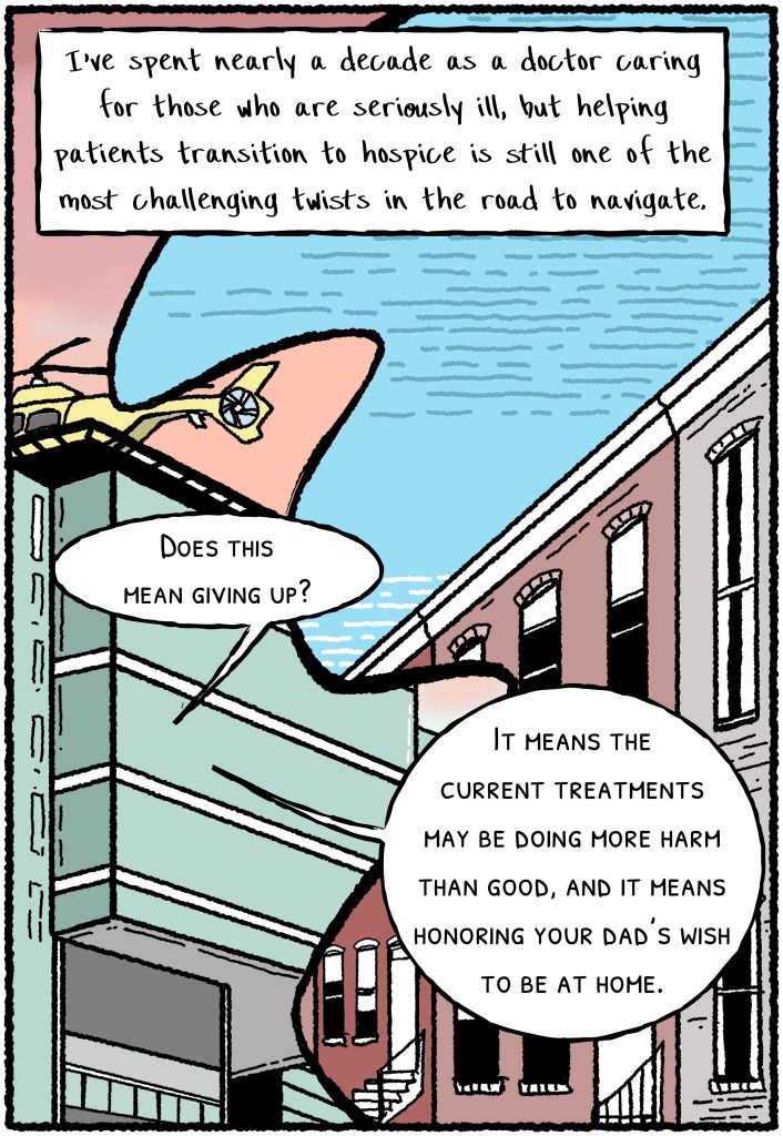 While such mergers might offer conceivable benefits in delivering technology and services, this for-profit structure also risks setting up a difficult tug-of-war between meeting the needs of patients and the demands of corporate growth. I wrote and illustrated the following piece last year for The Los Angeles Times, in the context of a spate of negative news stories about hospice, and I am re-posting here to my site for anyone who may have gotten stuck behind a paywall the first time around.