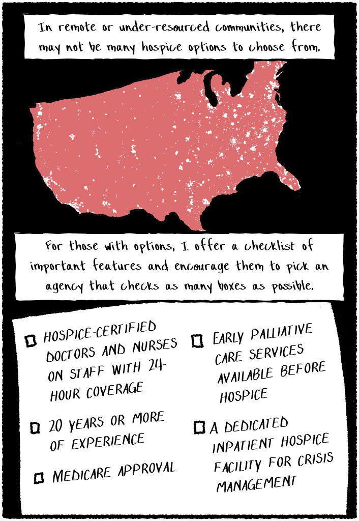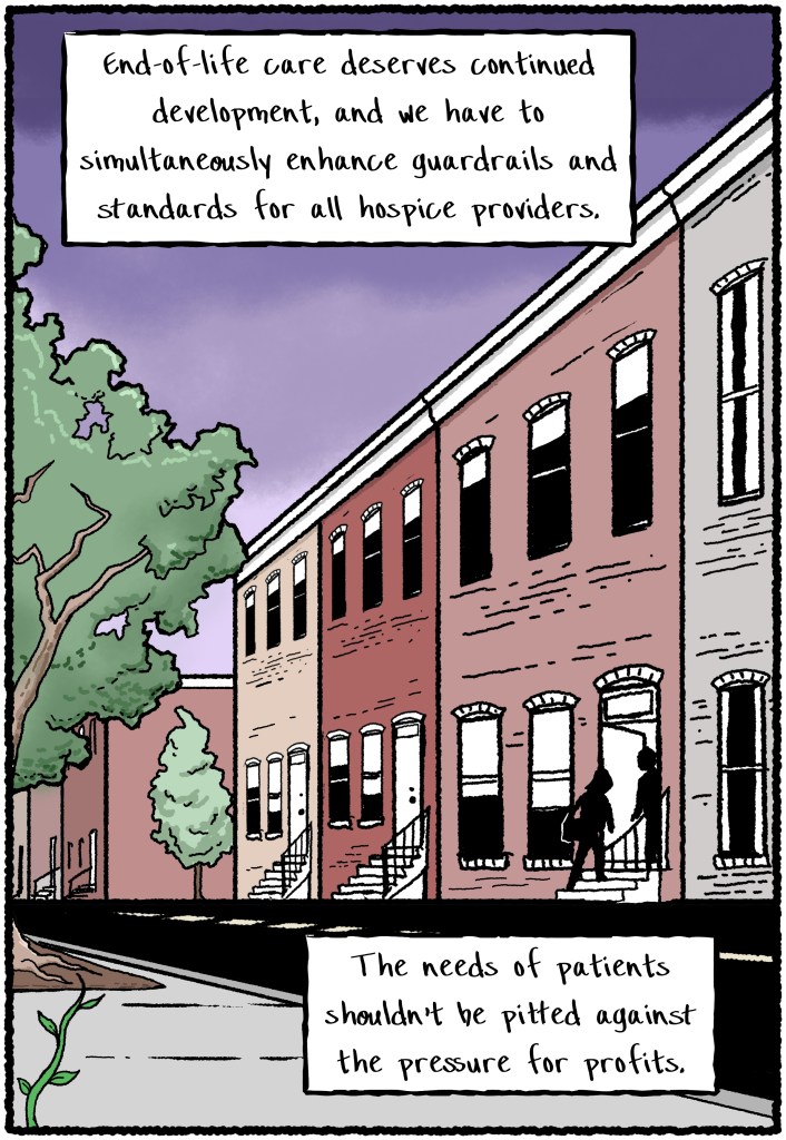 PS. There are earnest, hard-working docs, nurses, chaplains, nurse assistants, social workers, and others giving excellent care within for-profit hospices, and in many locations, for-profit providers have now become the only available agencies offering support. My intent is not to criticize the people striving to provide compassionate care, but the systemic structure that risks putting profits over patients.